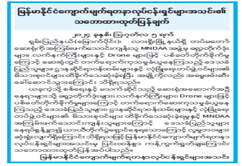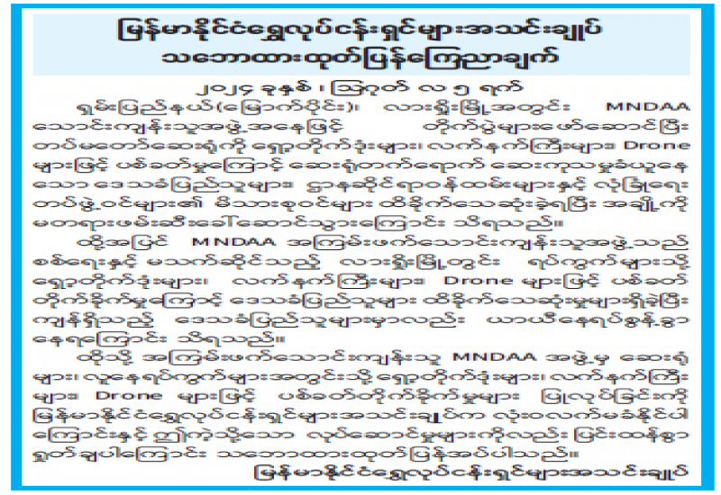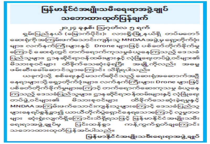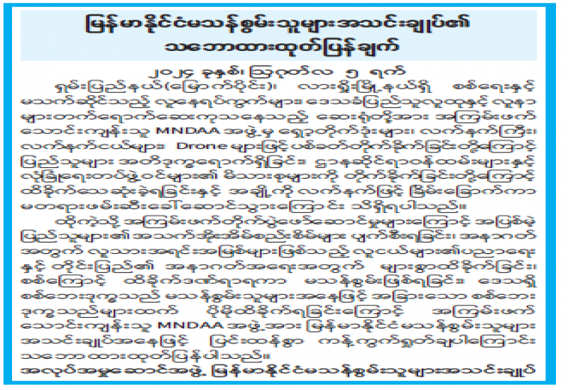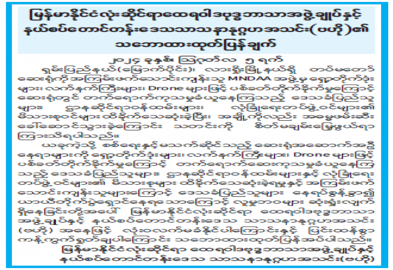 MNDAA အကြမ်းဖက်သောင်းကျန်းသူအဖွဲ့အနေဖြင့် ရှမ်းပြည်နယ် (မြောက်ပိုင်း)၊ လားရှိုးမြို့အတွင်း တိုက်ပွဲများဖော်ဆောင်ပြီး စစ်ရေးနှင့်သက်ဆိုင်ခြင်းမရှိသည့် တပ်မတော်ဆေးရုံအား ရှော့တိုက်ဒုံးများ၊ လက်နက်ကြီးများနှင့် Drone များဖြင့် ပစ်ခတ်တိုက်ခိုက်မှုကြောင့် ဆေးရုံတွင်တက်ရောက်ကုသမှုခံယူနေကြသည့် ဒေသခံပြည်သူများ၊ ဌာနဆိုင်ရာဝန်ထမ်းများနှင့် လုံခြုံရေးတပ်ဖွဲ့ဝင်များ၏ မိသားစုဝင်များ ထိခိုက်သေဆုံးခဲ့ရပြီး အချို့ကိုလည်း အဓမ္မဖမ်းဆီးခေါ်ဆောင်သွားကြောင်း သိရှိရသည်။
