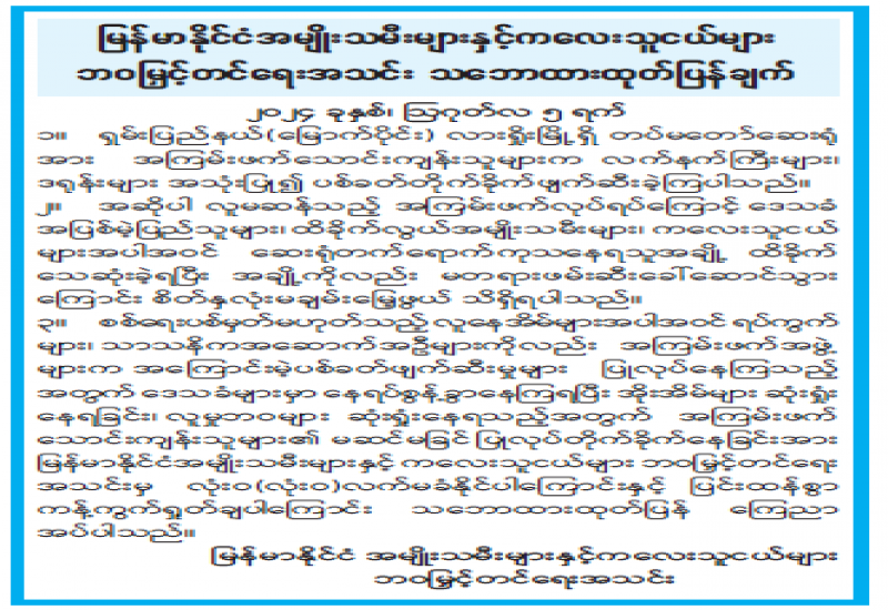 မြန်မာနိုင်ငံအမျိုးသမီးများနှင့်ကလေးသူငယ်များ ဘဝမြှင့်တင်ရေးအသင်း သဘောထားထုတ်ပြန်ချက်