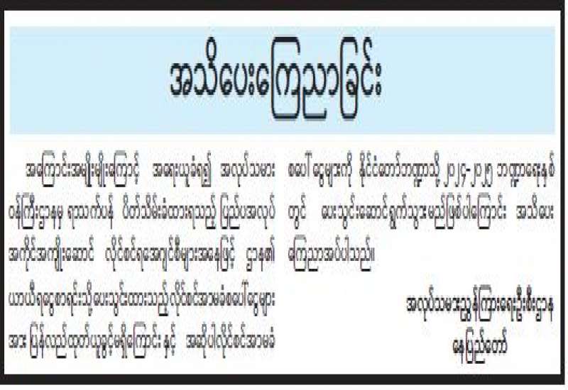 အကြောင်းအမျိုးမျိုးကြောင့် အရေးယူခံရ၍ အလုပ်သမားဝန်ကြီးဌာနမှ ရာသက်ပန် ပိတ်သိမ်းခံထားရသည့် ပြည်ပအလုပ်အကိုင်အကျိုးဆောင်လိုင်စင်ရအေဂျင်စီများအနေဖြင့် ဌာန၏ ယာယီရငွေစာရင်းသို့ ပေးသွင်းထားသည့် လိုင်စင်အာမခံစပေါ်ငွေများအား ပြန်လည်ထုတ်ယူခွင့်မရှိကြောင်းနှင့် အဆိုပါလိုင်စင်အာမခံစပေါ်ငွေများကို နိုင်ငံတော်ဘဏ္ဍာသို့ ၂၀၂၄-၂၀၂၅ ဘဏ္ဍာရေးနှစ်တွင် ပေးသွင်းဆောင်ရွက်သွားမည်ဖြစ်ပါကြောင်း အသိပေးကြေညာအပ်ပါသည်။