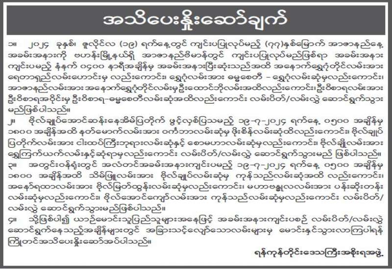 ၁။ ၂၀၂၄ ခုနှစ်၊ ဇူလိုင်လ(၁၉)ရက်နေ့တွင် ကျင်းပပြုလုပ်မည့် (၇၇)နှစ်မြောက် အာဇာနည်နေ့အခမ်းအနားကို ဗဟန်းမြို့နယ်ရှိ အာဇာနည်ဗိမာန်တွင် ကျင်းပပြုလုပ်မည်ဖြစ်ရာ အခမ်းအနားကျင်းပမည့် နံနက် ၀၄၀၀ နာရီအချိန်မှ အခမ်းအနားပြီးဆုံးသည်အထိ အနောက်ရွှေဂုံတိုင်လမ်းအား ရေတာရှည်လမ်းဟောင်းမှလည်းကောင်း၊ ရွှေဂုံလမ်းအား ဓမ္မစေတီ-ရွှေဂုံလမ်းဆုံမှလည်းကောင်း၊ အာဇာနည်လမ်းအား အနောက်ရွှေဂုံတိုင်လမ်းမှ ဦးထောင်ဘိုလမ်းအထိလည်းကောင်း၊ ဦးဝိစာရလမ်းအား ဦးဝိစာရအဝိုင်းမှ ဦးဝိစာရ-ဓမ္မစေတီလမ်းဆုံအထိလည်းကောင်း လမ်းပိတ်/လမ်းလွှဲဆောင်ရွက်သွားမည်ဖြစ်ပါသည်။