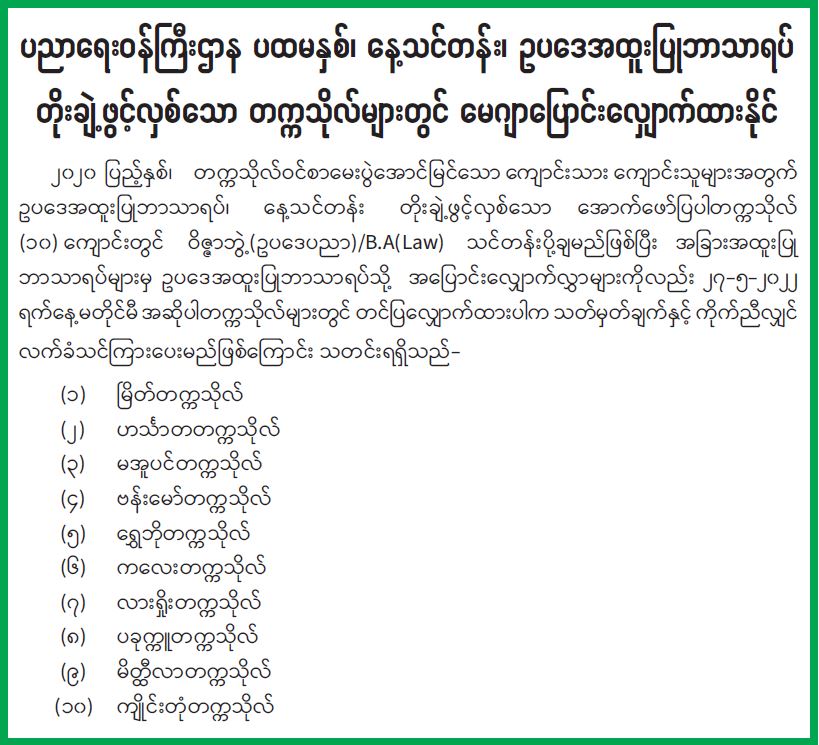 ပညာရေးဝန်ကြီးဌာန ပထမနှစ်၊ နေ့သင်တန်း၊ ဥပဒေအထူးပြုဘာသာရပ်တိုးချဲ့ဖွင့်လှစ်သော တက္ကသိုလ်များတွင် မေဂျာပြောင်းလျှောက်ထားနိုင် 05/10/2022