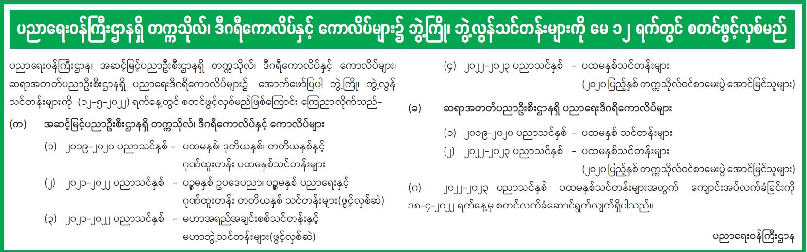 ပညာရေးဝန်ကြီးဌာနရှိ တက္ကသိုလ်၊ ဒီဂရီကောလိပ်နှင့် ကောလိပ်များ၌ ဘွဲ့ကြို၊ ဘွဲ့လွန်သင်တန်းများကို မေ ၁၂ ရက်တွင် စတင်ဖွင့်လှစ်မည် 05/10/2022