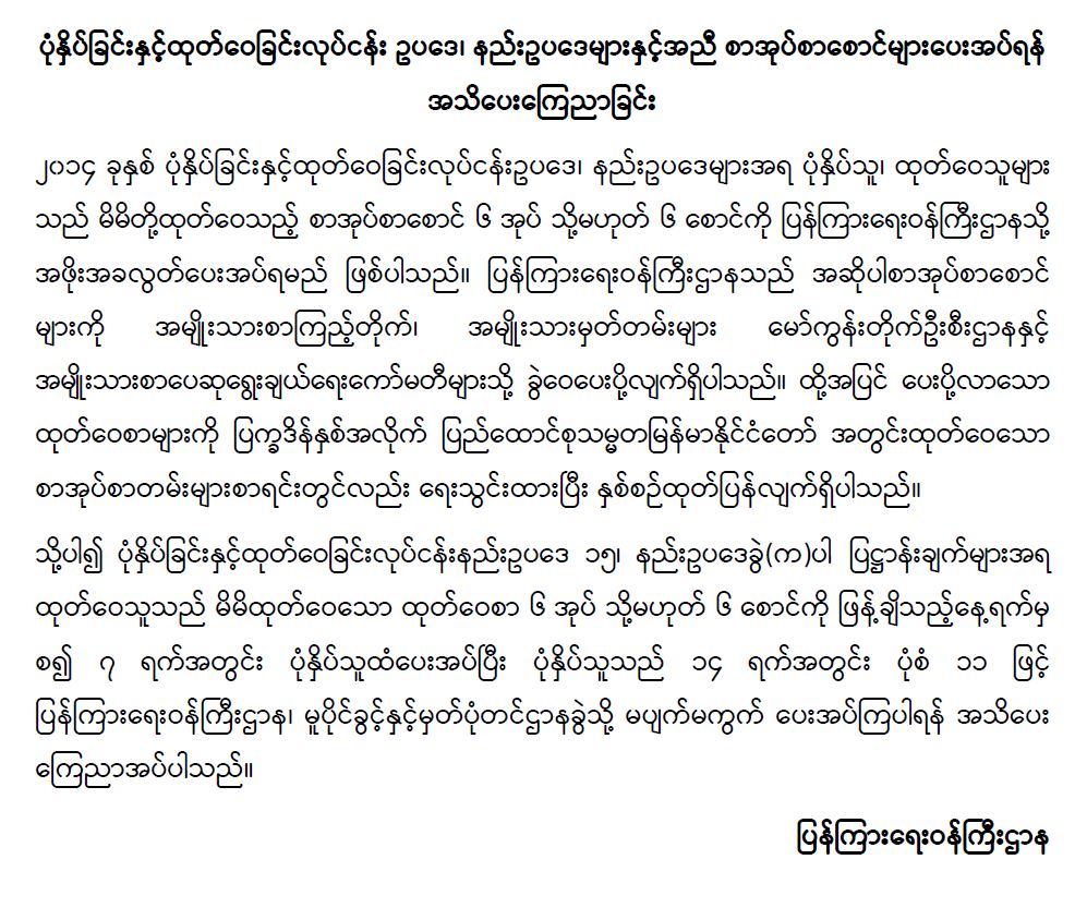 ပုံနှိပ်ခြင်းနှင့်ထုတ်ဝေခြင်းလုပ်ငန်း ဥပဒေ၊ နည်းဥပဒေများနှင့်အညီ စာအုပ်စာစောင်များပေးအပ်ရန် အသိပေးကြေညာခြင်း 07/08/2022 ပုံနှိပ်ခြင်းနှင့်ထုတ်ဝေခြင်းလုပ်ငန်း ဥပဒေ၊ နည်းဥပဒေများနှင့်အညီ စာအုပ်စာစောင်များပေးအပ်ရန် အသိပေးကြေညာခြင်း