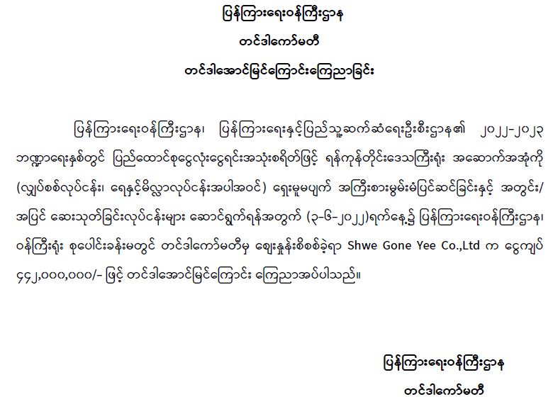 ပြန်ကြားရေးဝန်ကြီးဌာန၊ တင်ဒါကော်မတီ တင်ဒါအောင်မြင်ကြောင်းကြေညာခြင်း 06/07/2022 ပြန်ကြားရေးဝန်ကြီးဌာန၊ တင်ဒါကော်မတီ တင်ဒါအောင်မြင်ကြောင်းကြေညာခြင်း