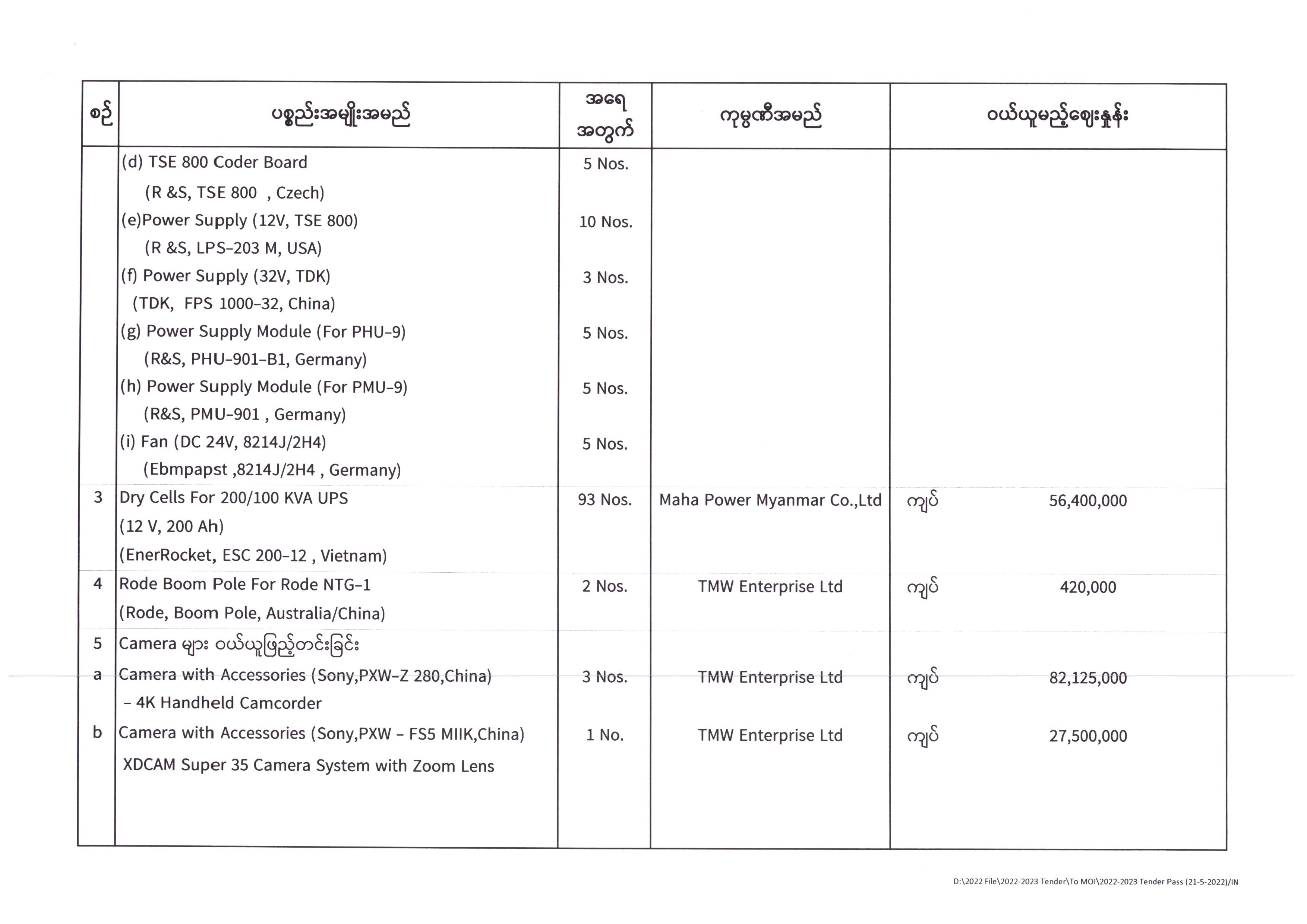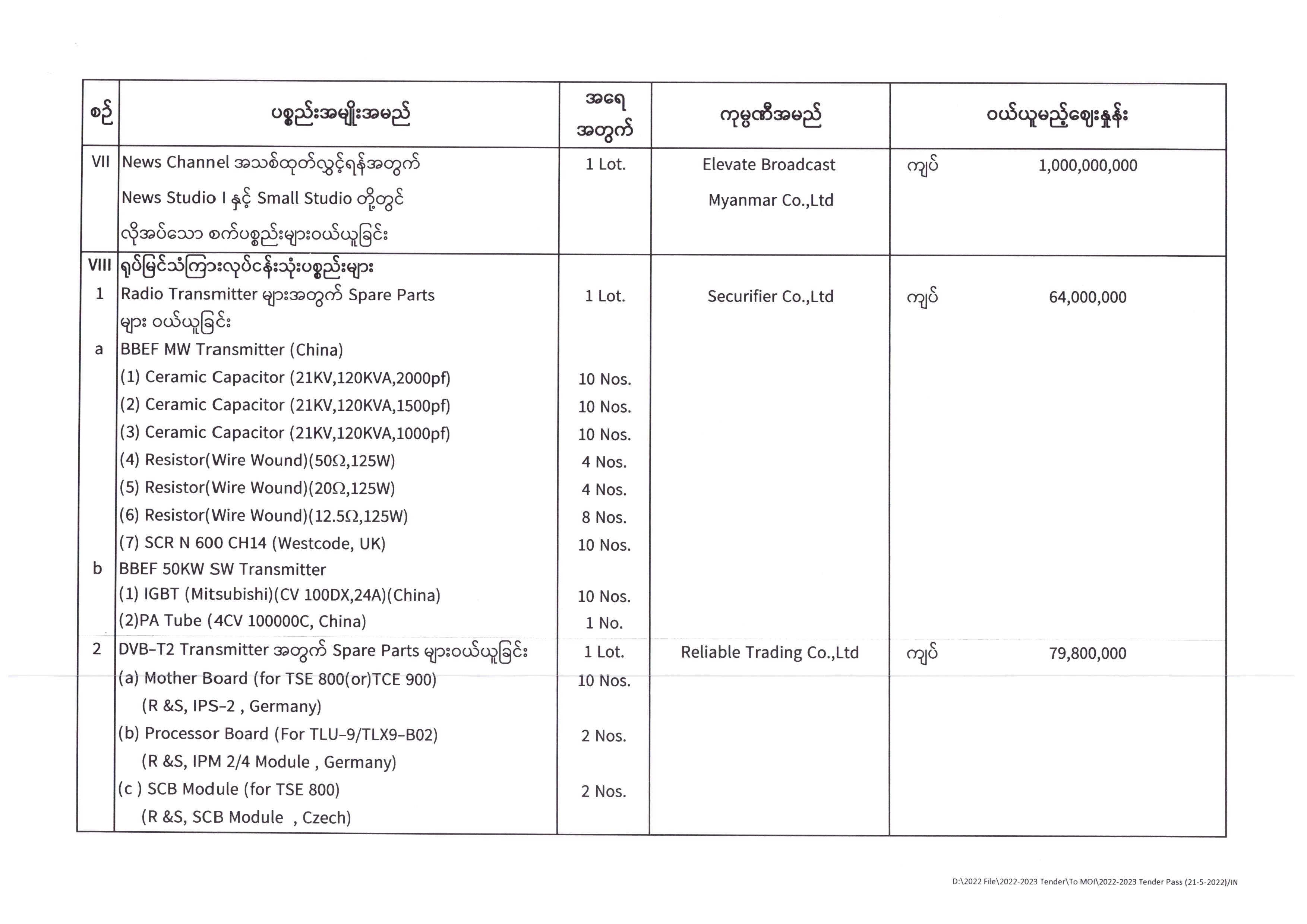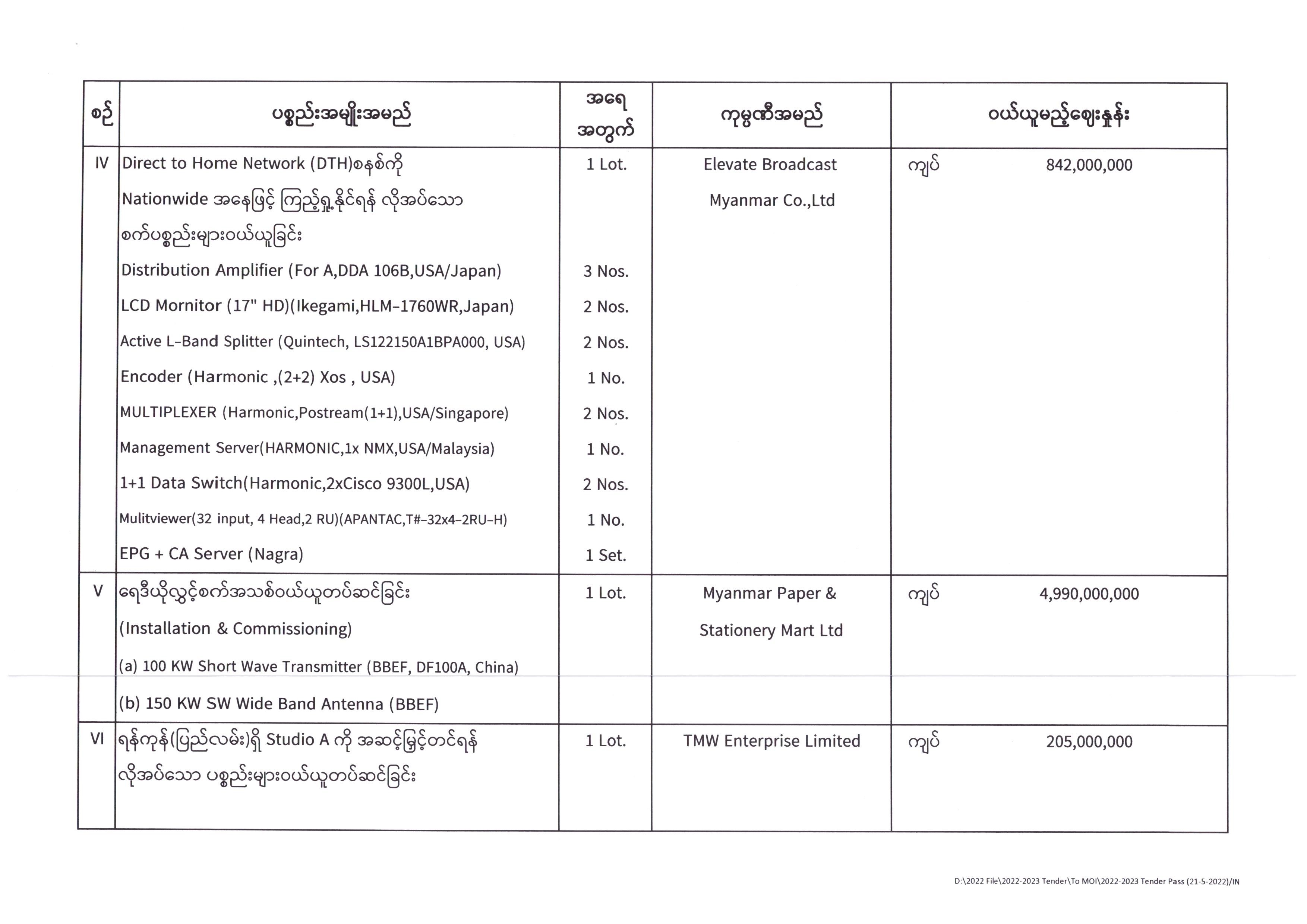 ပြန်ကြားရေးဝန်ကြီးဌာန၊ ပြည်တွင်း/ပြည်ပ ပစ္စည်းများဝယ်ယူရေးနှင့်ထုခွဲရောင်းချရေးကော်မတီအဖွဲ့၊ တင်ဒါအောင်မြင်ကြောင်းကြေညာခြင်း 06/08/2022