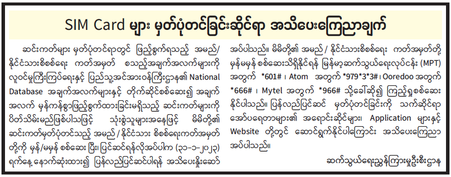 SIM Card များ မှတ်ပုံတင်ခြင်းဆိုင်ရာ အသိပေးကြေညာချက်