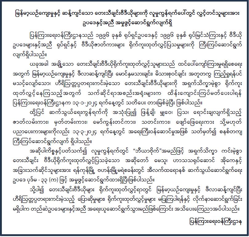 သို့ပါ၍ တေးသီချင်းဗီဒီယိုများ ရိုက်ကူးထုတ်လွှင့်ရာတွင် မြန်မာ့ယဉ်ကျေးမှုနှင့် ဖီလာဆန့်ကျင်ပြီး ဟီရိဩတ္တပ္ပတရားကင်းမဲ့သည့် ပြောဆိုမှုများ၊ ရိုက်ကူးထုတ်လွှင့်မှုများမပြုကြပါရန်နှင့် လိုက်နာဆောင်ရွက်ခြင်းမရှိပါက တည်ဆဲဥပဒေများနှင့်အညီ အရေးယူဆောင်ရွက်သွားမည်ဖြစ်ကြောင်း အသိပေးကြေညာအပ်ပါသည်။
