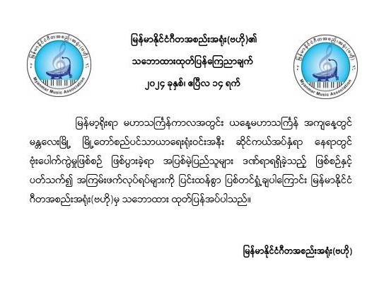 မြန်မာနိုင်ငံ ဂီတအစည်းအရုံး (ဗဟို)၏ သဘောထားထုတ်ပြန်ကြေညာချက်