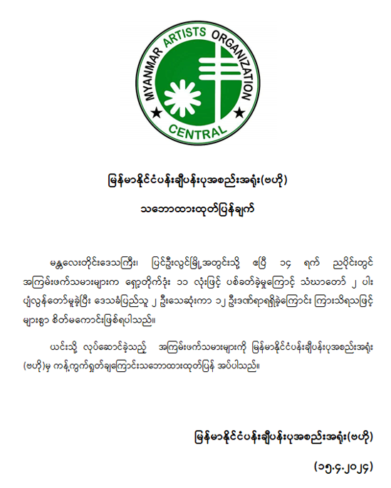 မြန်မာနိုင်ငံပန်းချီပန်းပုအစည်းအရုံး (ဗဟို) သဘောထားထုတ်ပြန်ကြေညာချက်