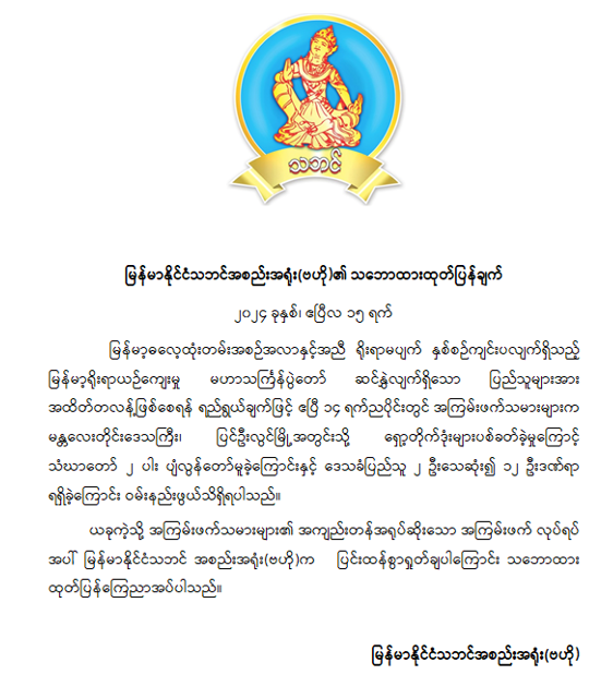 မြန်မာနိုင်ငံသဘင်အစည်းအရုံး(ဗဟို)၏ သဘောထားထုတ်ပြန်ချက်