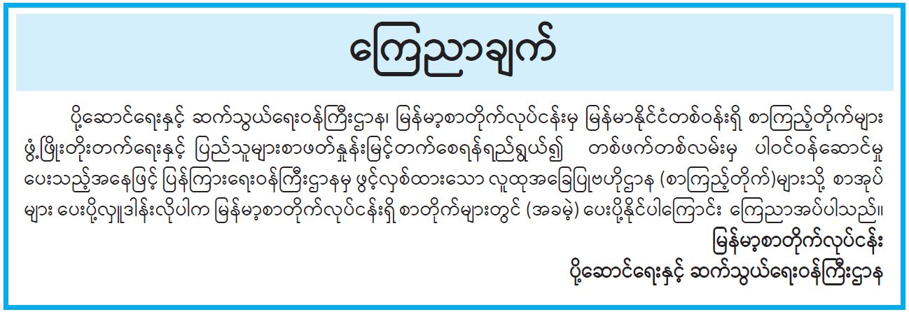 ပို့ဆောင်ရေးနှင့်ဆက်သွယ်ရေးဝန်ကြီးဌာန၊ မြန်မာ့စာတိုက်လုပ်ငန်းမှ မြန်မာနိုင်ငံတစ်ဝန်းရှိ စာကြည့်တိုက်များ ဖွံ့ဖြိုးတိုးတက်ရေးနှင့် ပြည်သူများစာဖတ်နှုန်းမြင့်တက်စေရန်ရည်ရွယ်၍ တစ်ဖက်တစ်လမ်းမှ ပါဝင်ဝန်ဆောင်မှုပေးသည့်အနေဖြင့် ပြန်ကြားရေးဝန်ကြီးဌာနမှ ဖွင့်လှစ်ထားသော လူထုအခြေပြုဗဟိုဌာန (စာကြည့်တိုက်) များသို့ စာအုပ်များပေးပို့လှူဒါန်းလိုပါက မြန်မာ့စာတိုက်လုပ်ငန်းရှိ စာတိုက်များတွင် (အခမဲ့) ပေးပို့နိုင်ပါကြောင်း ကြေညာအပ်ပါသည်။