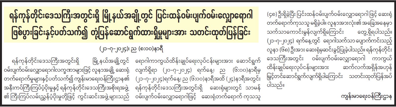 ရန်ကုန်တိုင်းဒေသကြီးအတွင်းရှိ မြို့နယ်အချို့တွင် ဝမ်းပျက်ဝမ်းလျှောရောဂါလက္ခဏာများဖြင့် လူနာအချို့ ဆေးရုံတက်ရောက်မှုများနှင့်ပတ်သက်၍ ကျန်းမာရေးဝန်ကြီးဌာန၏ အနီးကပ်ကြီးကြပ်ပံ့ပိုးမှုနှင့် ရန်ကုန်တိုင်းဒေသကြီးအစိုးရအဖွဲ့၏ ကြီးကြပ်လမ်းညွှန်ပံ့ပိုးမှုတို့ဖြင့် ကွင်းဆင်းအဖွဲ့များသည် ရောဂါကာကွယ်ထိန်းချုပ်ရေးလုပ်ငန်းများအား ဆောင်ရွက်လျက်ရှိရာ (၂၀-၇-၂၀၂၄) ရက်နေ့၊ ည (၆:၀၀)နာရီမှ (၂၁-၇-၂၀၂၄)ရက်နေ့၊ ည (၆:၀၀)နာရီအထိ (၂၄)နာရီအတွင်း ရန်ကုန်တိုင်းဒေသကြီးအတွင်းရှိ ဆေးရုံများတွင် သာမန်ဝမ်းပျက်ဝမ်းလျှောရောဂါဖြင့် ဆေးရုံတက်ရောက်ကုသသူ(၄၈)ဦးရှိခဲ့ပြီး ပြင်းထန်ဝမ်းပျက်ဝမ်းလျှောရောဂါဖြင့် ဆေးရုံတက်ရောက်ကုသသူမရှိခဲ့ပါ။ လူနာအားလုံး၏ အခြေအနေမှာ သက်သာကောင်းမွန်လျက်ရှိကြောင်း တွေ့ရှိရပါသည်။ (၂၁-၇-၂၀၂၄)ရက်နေ့တွင် ရောဂါသက်သာ ပျောက်ကင်းသည့် လူနာ(၆၈)ဦးအား ဆေးရုံမှဆင်းခွင့်ပြုခဲ့ပါသည်။ ရန်ကုန်တိုင်း ဒေသကြီးအတွင်း ဝမ်းပျက်ဝမ်းလျှောရောဂါ ကာကွယ်ထိန်းချုပ်ရေးလုပ်ငန်းများအား ဆက်လက်အရှိန်အဟုန် မြှင့်တင်ဆောင်ရွက်လျက်ရှိပါကြောင်း သတင်းထုတ်ပြန်အပ်ပါသည်။
