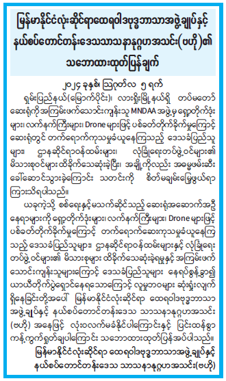 မြန်မာနိုင်ငံလုံးဆိုင်ရာထေရဝါဒဗုဒ္ဓဘာသာအဖွဲ့ချုပ်နှင့် နယ်စပ်တောင်တန်းဒေသသာသနာနုဂ္ဂဟအသင်း (ဗဟို) ၏ သဘောထားထုတ်ပြန်ချက် 08/06/2024