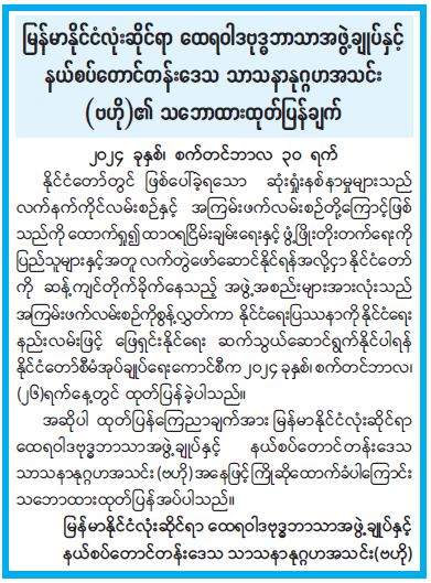 မြန်မာနိုင်ငံလုံးဆိုင်ရာ ထေရဝါဒဗုဒ္ဓဘာသာအဖွဲ့ချုပ်နှင့် နယ်စပ်တောင်တန်းဒေသ သာသနာနုဂ္ဂဟအသင်း (ဗဟို) ၏ သဘောထားထုတ်ပြန်ချက် 10/01/2024