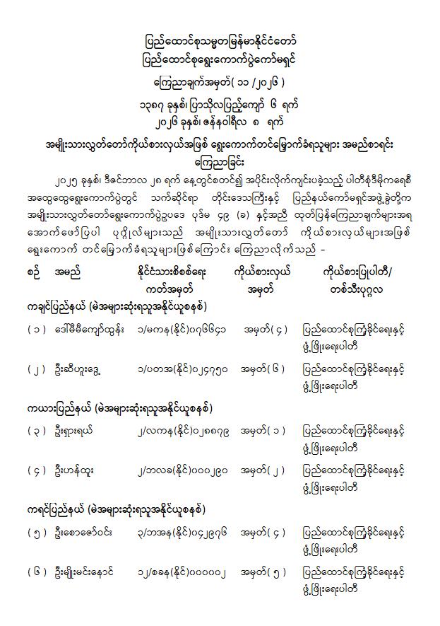 အမျိုးသားလွှတ်တော်ကိုယ်စားလှယ်အဖြစ် ရွေးကောက်တင်မြှောက်ခံရသူများ အမည်စာရင်းကြေညာခြင်း