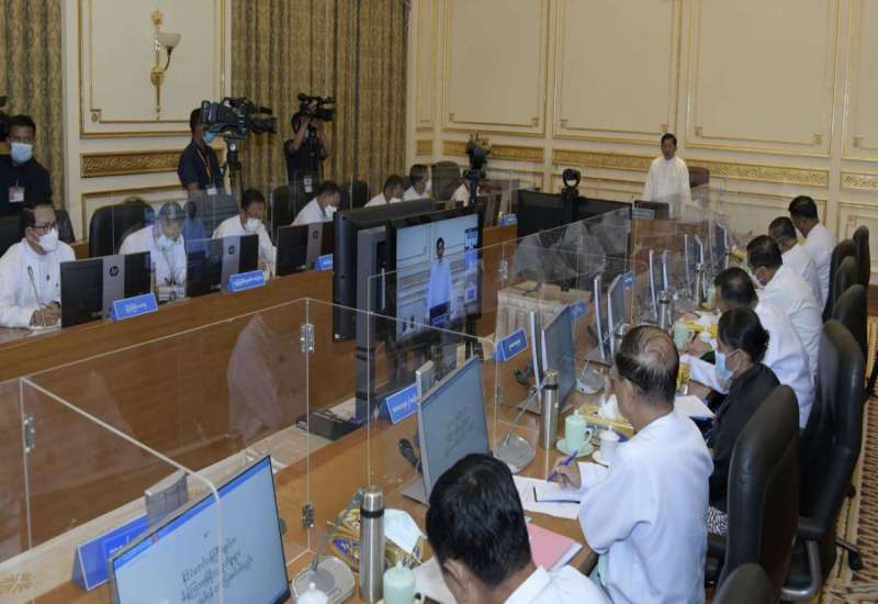 ပြည်ထောင်စုအစိုးရအဖွဲ့ အစည်းအဝေး အမှတ်စဉ်(၆/၂၀၂၂)ကို ယနေ့မွန်းလွဲပိုင်းတွင် နေပြည်တော်ရှိ နိုင်ငံတော်စီမံအုပ်ချုပ်ရေးကောင်စီဥက္ကဋ္ဌရုံး အစည်းအဝေးခန်းမ၌ ကျင်းပရာ နိုင်ငံတော်စီမံအုပ်ချုပ်ရေးကောင်စီဥက္ကဋ္ဌ နိုင်ငံတော်ဝန်ကြီးချုပ် ဗိုလ်ချုပ်မှူးကြီး မင်းအောင်လှိုင် တက်ရောက်အမှာစကားပြောကြားသည်။