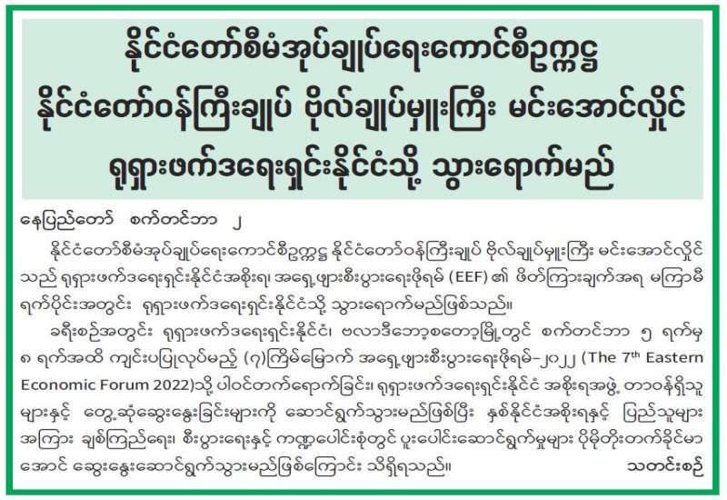 (၇) ကြိမ်မြောက် အရှေ့ဖျားစီးပွားရေးဖိုရမ် (The 7th Eastern Economic Forum-2022)ကို ရုရှားဖက်ဒရေးရှင်းနိုင်ငံ၊ ဗလာဒီဗော့စတော့ခ်မြို့ Far Eastern Federal University(FEFU) ၌ စက်တင်ဘာ ၅ ရက်နေ့တွင် စတင်ဖွင့်လှစ်ခဲ့ပြီး တွေ့ဆုံဆွေးနွေးမှုများ၊ နားလည်မှုစာချွန်လွှာ ရေးထိုးပွဲများ၊ တွေ့ဆုံမေးမြန်းမှုများကို ဆောင်ရွက်လျက်ရှိကြပြီး ကဏ္ဍပေါင်းစုံအလိုက် ပြခန်းများဖြင့်လည်း ခင်းကျင်းပြသထားသည်။