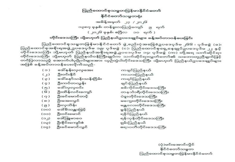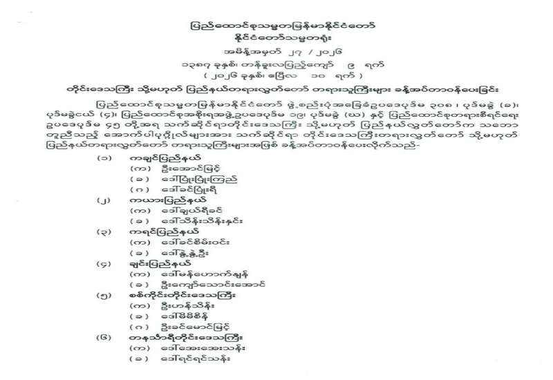 တိုင်းဒေသကြီး သို့မဟုတ် ပြည်နယ်တိုင်းရင်းသားလူမျိုးရေးရာဝန်ကြီးများ ခန့်အပ်တာဝန်ပေးခြင်း