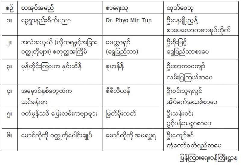 ​​​​​​​၂၀၁၄ ခုနှစ် ပုံနှိပ်ခြင်းနှင့် ထုတ်ဝေခြင်းလုပ်ငန်း ဥပဒေ၊ နည်းဥပဒေများအရ ထုတ်ဝေသူများသည် မိမိတို့ထုတ်ဝေသည့် စာအုပ်စာစောင်ငါးအုပ် သို့မဟုတ် ငါးစောင်ကို ပြန်ကြားရေးဝန်ကြီးဌာနသို့ အဖိုးအခလွတ်ပေးအပ်ရမည် ဖြစ်ပါသည်။
