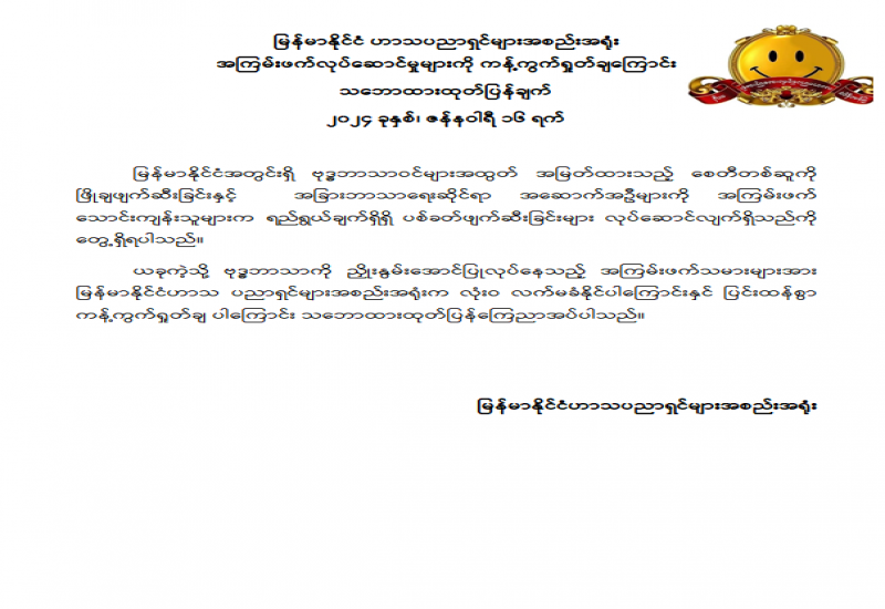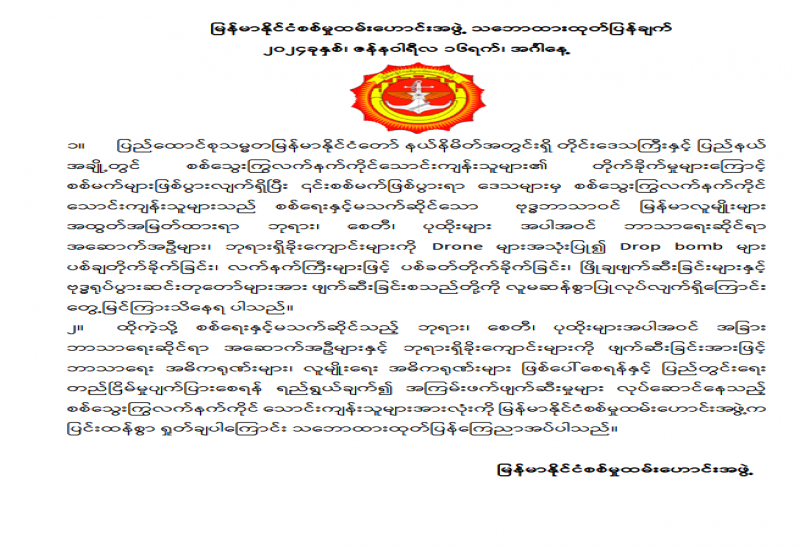 ၁။ ပြည်ထောင်စုသမ္မတမြန်မာနိုင်ငံတော် နယ်နိမိတ်အတွင်းရှိ တိုင်းဒေသကြီးနှင့် ပြည်နယ်အချို့တွင် စစ်သွေးကြွလက်နက်ကိုင်သောင်းကျန်းသူများ၏ တိုက်ခိုက်မှု များကြောင့် စစ်မက်များဖြစ်ပွားလျက်ရှိပြီး ၎င်းစစ်မက်ဖြစ်ပွားရာ ဒေသများမှ စစ်သွေးကြွလက်နက်ကိုင်သောင်းကျန်းသူများသည် စစ်ရေးနှင့်မသက်ဆိုင်သော ဗုဒ္ဓဘာသာဝင်မြန်မာလူမျိုးများ အထွတ်အမြတ်ထားရာ ဘုရား၊ စေတီ၊ ပုထိုးများအပါအဝင် ဘာသာရေးဆိုင်ရာ အဆောက်အဦများ၊ ဘုရားရှိခိုးကျောင်းများကို Drone များအသုံးပြု၍ Drop bomb များ ပစ်ချတိုက်ခိုက်ခြင်း၊ လက်နက်ကြီးများဖြင့် ပစ်ခတ်တိုက်ခိုက်ခြင်း၊ ဖြိုချဖျက်ဆီးခြင်းများနှင့် ဗုဒ္ဓရုပ်ပွားဆင်းတုတော်များအား ဖျက်ဆီးခြင်းစသည်တို့ကို လူမဆန်စွာပြုလုပ်လျက်ရှိကြောင်း တွေ့မြင်ကြားသိနေရ ပါသည်။