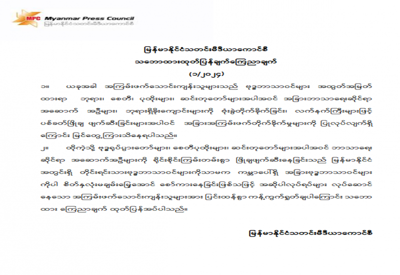 ​​​​​​​ပြန်ကြားရေးဝန်ကြီးဌာနအနေဖြင့် ပုံနှိပ်ခြင်းနှင့်ထုတ်ဝေခြင်းလုပ်ငန်းနည်းဥပဒေထွက်ရှိသည့် ၁၀-၁၀-၂၀၁၄ ရက်နေ့မှစ၍ ပုံနှိပ်ခြင်း၊ ထုတ်ဝေခြင်းနှင့် သတင်းအေဂျင်စီလုပ်ငန်း အသိအမှတ်ပြုလက်မှတ်များအား ငါးနှစ်သက်တမ်း ခွင့်ပြုပေးခဲ့ပါသည်။