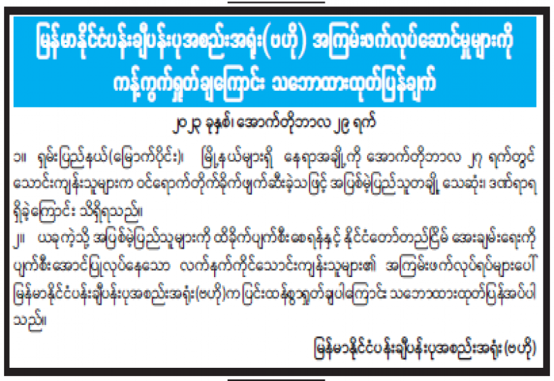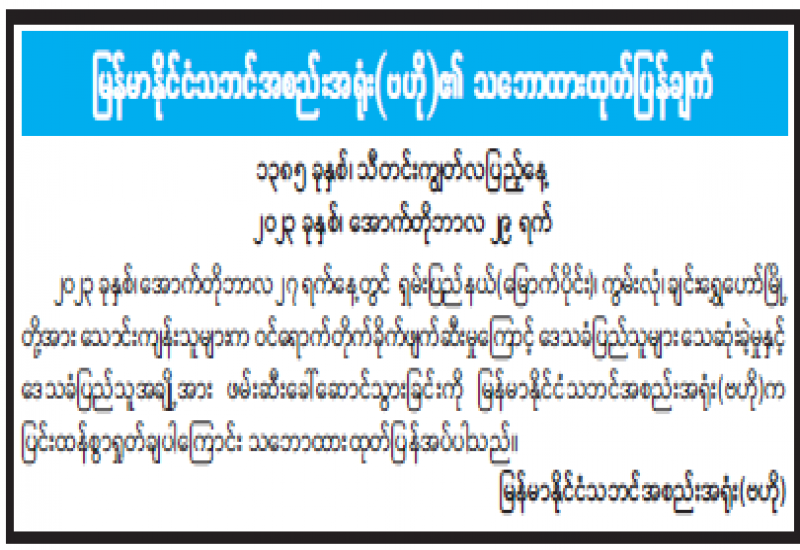 မြန်မာနိုင်ငံသဘင်အစည်းအရုံး(ဗဟို)၏ သဘောထားထုတ်ပြန်ချက်