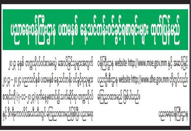 ပညာရေးဝန်ကြီးဌာန ပထမနှစ် နေ့သင်တန်းဝင်ခွင့်ရစာရင်းများ ထုတ်ပြန်မည်