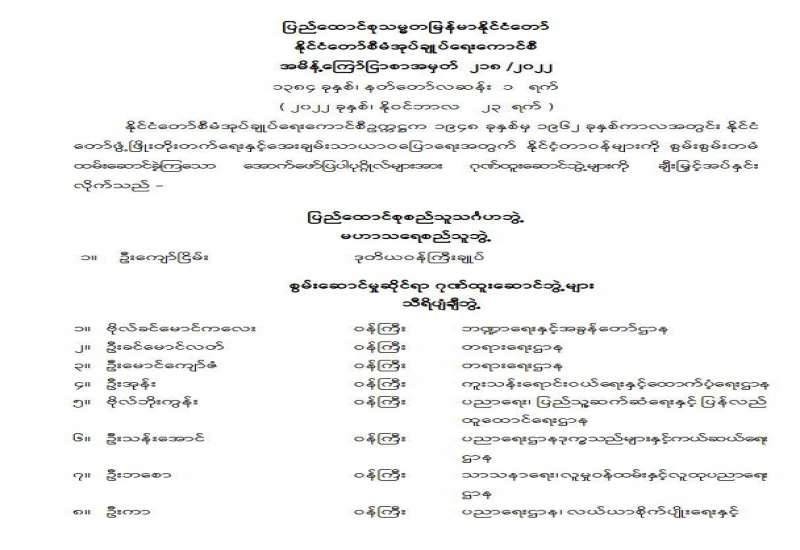 ၁။ ၂၀၂၂ ခုနှစ်အတွင်း ပြည်ထောင်စုသမ္မတမြန်မာနိုင်ငံတော်၊ နိုင်ငံတော်စီမံအုပ်ချုပ်ရေး ကောင်စီ အမိန့်ကြော်ငြာစာအမှတ်(၂/၂၀၂၂)၊ (၅၄/၂၀၂၂)၊ (၆၃/၂၀၂၂)၊ (၂၁၁/၂၀၂၂)၊ (၂၁၂/၂၀၂၂)၊ (၂၁၃/၂၀၂၂)၊ (၂၁၄/၂၀၂၂)၊ (၂၁၅/၂၀၂၂)၊ (၂၁၈/၂၀၂၂)၊ (၂၁၉/၂၀၂၂)၊ (၂၂၀/၂၀၂၂)၊ (၂၂၁/၂၀၂၂)တို့ဖြင့် အဂ္ဂမဟာသီရိသုဓမ္မဘွဲ့၊ သတိုးသီရိသုဓမ္မဘွဲ့၊ အဂ္ဂမဟာ သရေစည်သူဘွဲ့၊ သတိုးမဟာသရေစည်သူဘွဲ့၊ မဟာသရေစည်သူဘွဲ့၊ သရေစည်သူဘွဲ့၊ စည်သူဘွဲ့၊ သူရဘွဲ့၊ သီရိပျံချီဘွဲ့၊ ဇေယျကျော်ထင်ဘွဲ့၊ ဝဏ္ဏကျော်ထင်ဘွဲ့၊ အလင်္ကာ ကျော်စွာဘွဲ့၊ သိပ္ပကျော်စွာဘွဲ့ စသည့် စွမ်းဆောင်မှုဆိုင်ရာ ဂုဏ်ထူးဆောင်ဘွဲ့များကို ချီးမြှင့်ခဲ့ပြီးဖြစ်ပါသည်။