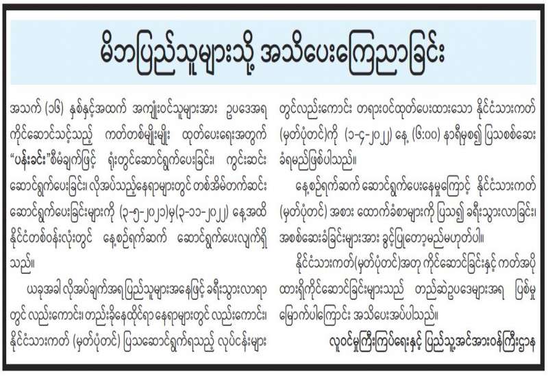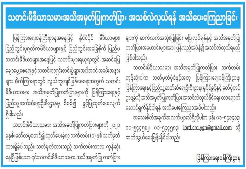 သတင်းမီဒီယာသမားအသိအမှတ်ပြုကတ်ပြား အသစ်လဲလှယ်ရန် အသိပေးကြေညာခြင်း