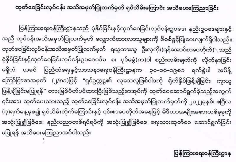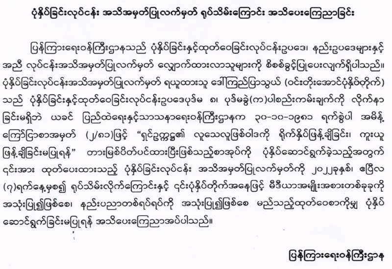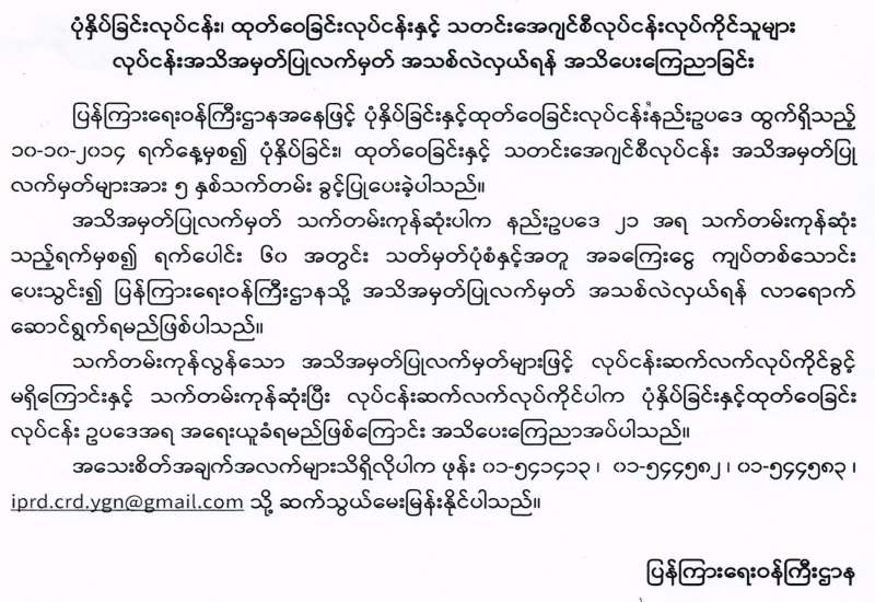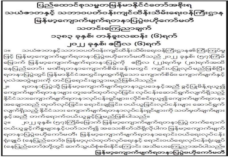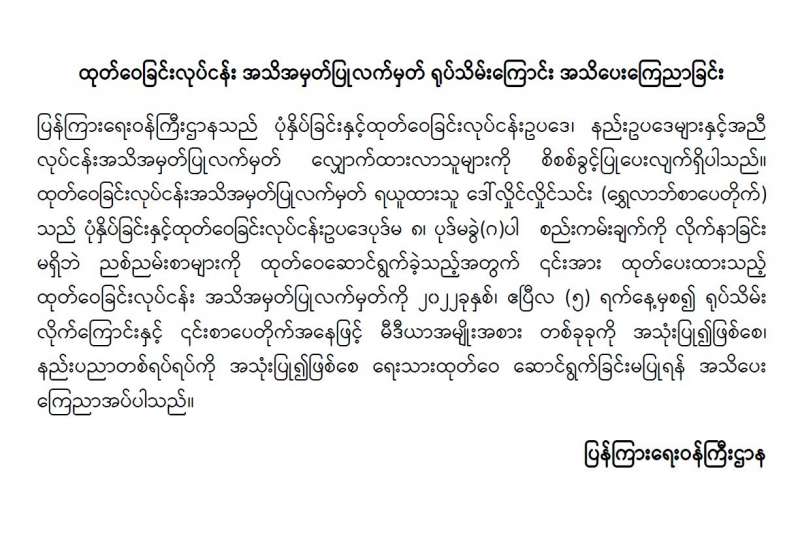 ပုံနှိပ်ခြင်းလုပ်ငန်း၊ ထုတ်ဝေခြင်းလုပ်ငန်းနှင့် သတင်းအေဂျင်စီလုပ်ငန်းလုပ်ကိုင်သူများ လုပ်ငန်းအသိအမှတ်ပြုလက်မှတ် အသစ်လဲလှယ်ရန် အသိပေးကြေညာခြင်း