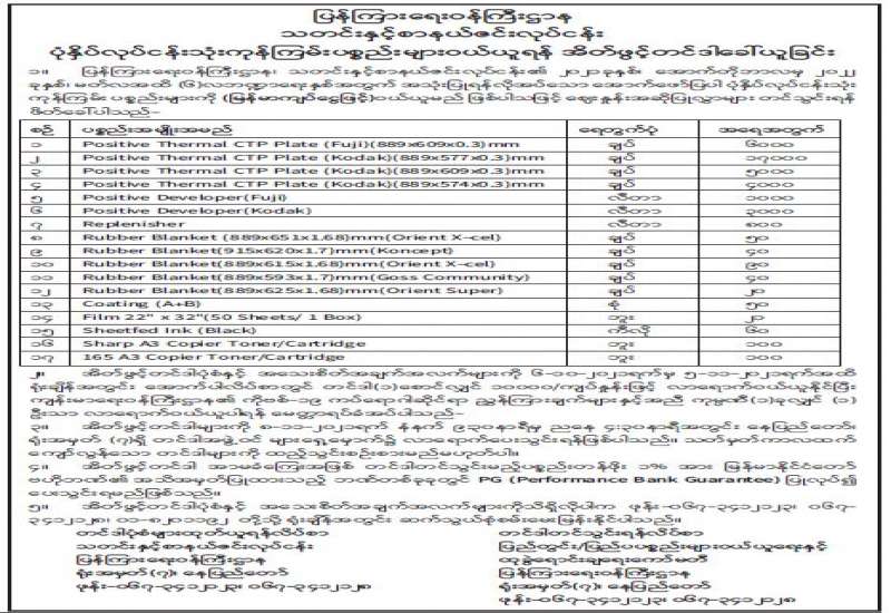 ပြန်ကြားရေးဝန်ကြီးဌာန သတင်းနှင့်စာနယ်ဇင်းလုပ်ငန်း ပုံနှိပ်လုပ်ငန်းသုံးကုန်ကြမ်းပစ္စည်းများဝယ်ယူရန် အိတ်ဖွင့်တင်ဒါခေါ်ယူခြင်း