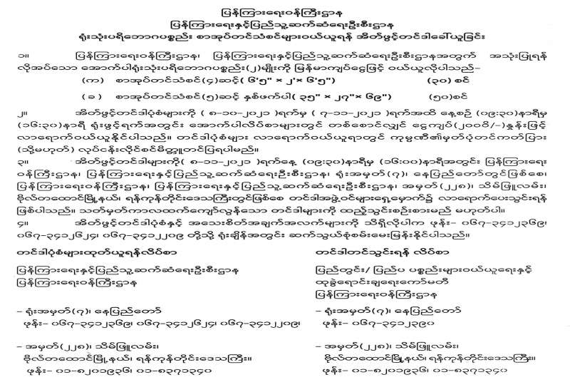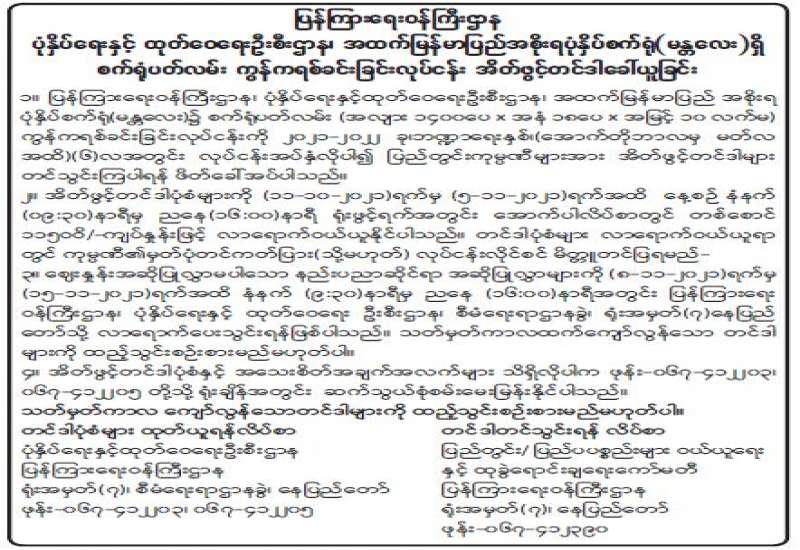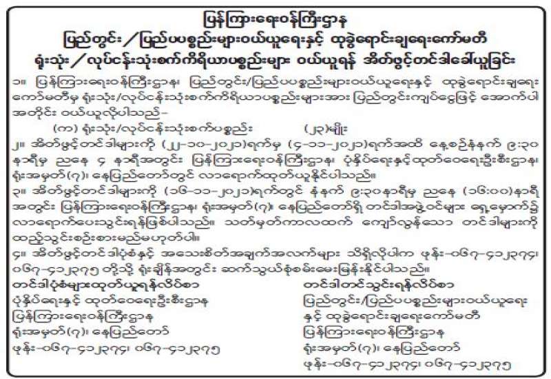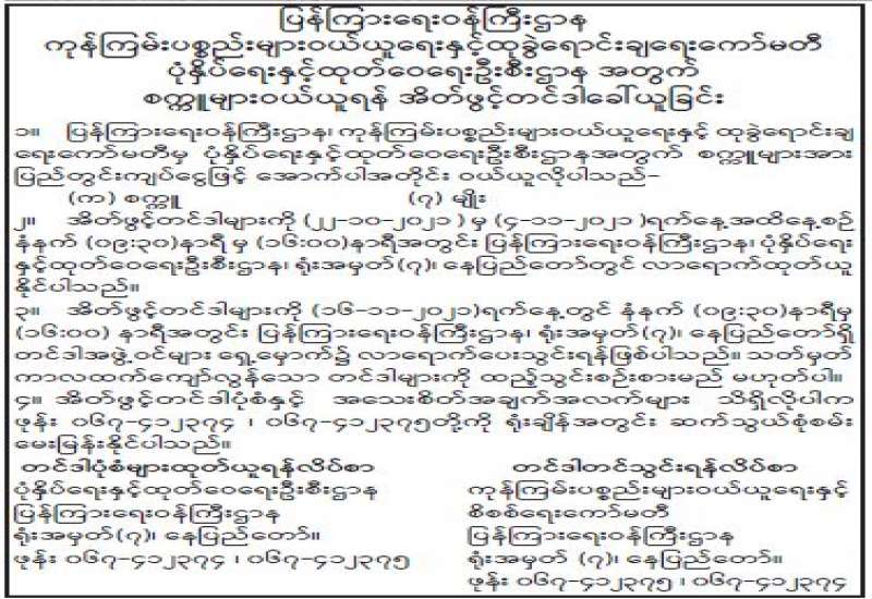 ပြန်ကြားရေးဝန်ကြီးဌာန ကုန်ကြမ်းပစ္စည်းများဝယ်ယူရေးနှင့်ထုခွဲရောင်းချရေးကော်မတီ ပုံနှိပ်ရေးနှင့် ထုတ်ဝေရေးဦးစီးဌာန အတွက် စက္ကူများဝယ်ယူရန် အိတ်ဖွင့်တင်ဒါခေါ်ယူခြင်း