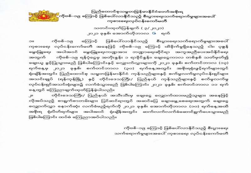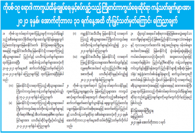 ပြည်ထောင်စုသမ္မတမြန်မာနိုင်ငံတော်အစိုးရ ကိုဗစ်-၁၉ ကြောင့် ဖြစ်ပေါ်လာနိုင်သည့် စီးပွားရေးသက်ရောက်မှုများအပေါ် ကုစားရေးလုပ်ငန်းကော်မတီ သတင်းထုတ်ပြန်ချက် (၃/၂၀၂၁)