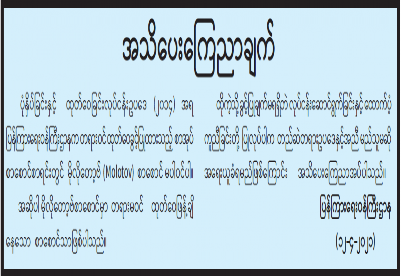 ၁။ တရားမဝင်ဖွဲ့စည်းထားသည့် ပြည်ထောင်စုလွှတ်တော်ကိုယ်စားပြုကော်မတီ (Committee Representing Pyidaungsu Hluttaw-CRPH) နှင့် ယင်းကော်မတီက ဖွဲ့စည်းသော အဖွဲ့အစည်းများကို မတရားအသင်းအဖြစ် ပြည်ထဲရေးဝန်ကြီးဌာန၏ အမိန့်ကြော်ငြာစာအမှတ် (၂/၂၀၂၁) ဖြင့် ၂၀၂၁ ခုနှစ်၊ မတ်လ ၂၁ ရက်နေ့တွင် ထုတ်ပြန်ကြေညာခဲ့ပြီး ဖြစ်ပါသည်။