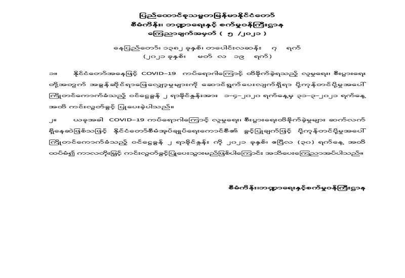 ၁။ နိုင်ငံတော်စီမံအုပ်ချုပ်ရေးကောင်စီ၏ ၁၃၈၂ ခုနှစ်၊ တပေါင်းလဆန်း ၂ ရက်၊ ၂၀၂၁ ခုနှစ်၊ မတ်လ ၁၄ ရက်စွဲပါ စစ်အုပ်ချုပ်ရေး(Martial Law)အမိန့်အမှတ် ၁/ ၂၀၂၁၊ ၁၃၈၂ ခုနှစ်၊ တပေါင်း လဆန်း ၃ ရက်၊ ၂၀၂၁ ခုနှစ်၊ မတ်လ ၁၅ ရက်စွဲပါ စစ်အုပ်ချုပ်ရေး(Martial Law)အမိန့်အမှတ် ၂/ ၂၀၂၁ တို့ ဖြင့် ရန်ကုန်တိုင်းစစ်ဌာနချုပ်၊ တိုင်းမှူးအား စစ်အုပ်ချုပ်ရေးဒေသအဖြစ် ကြေညာထားသော ရန်ကုန်တိုင်းစစ်ဌာနချုပ်နယ်မြေ ဖြစ်သည့် ရန်ကုန်တိုင်းဒေသကြီး၊ လှိုင်သာယာမြို့နယ်၊ ရွှေပြည်သာ မြို့နယ်၊ ဒဂုံမြို့သစ်(မြောက်ပိုင်း)မြို့နယ်၊ ဒဂုံမြို့သစ်(တောင်ပိုင်း)မြို့နယ်၊ ဒဂုံမြို့သစ်(ဆိပ်ကမ်း) မြို့နယ် နှင့် မြောက်ဥက္ကလာပမြို့နယ်များအတွင်း လုံခြုံရေး၊ တရားဥပဒေစိုးမိုးရေးနှင့် နယ်မြေအေးချမ်းသာယာ ရေးကို ပိုမိုထိရောက်စွာဆောင်ရွက်နိုင်ရန်အလို့ငှာ အုပ်ချုပ်ရေးနှင့် တရားစီရင်ရေးဆိုင်ရာ စစ်အုပ်ချုပ်ရေး (Martial Law) အာဏာကိုကျင့်သုံးရန် ဖွဲ့စည်းပုံအခြေခံဥပဒေ ပုဒ်မ ၄၁၉ အရ အပ်နှင်းခဲ့ပါသည်။