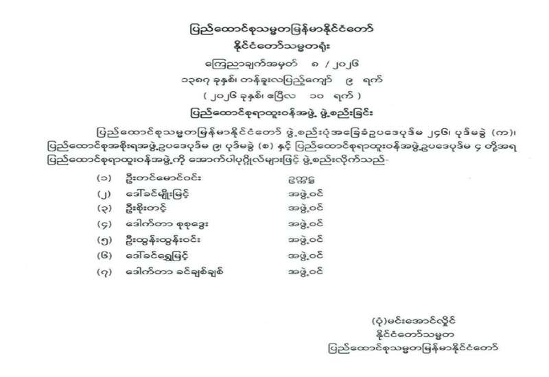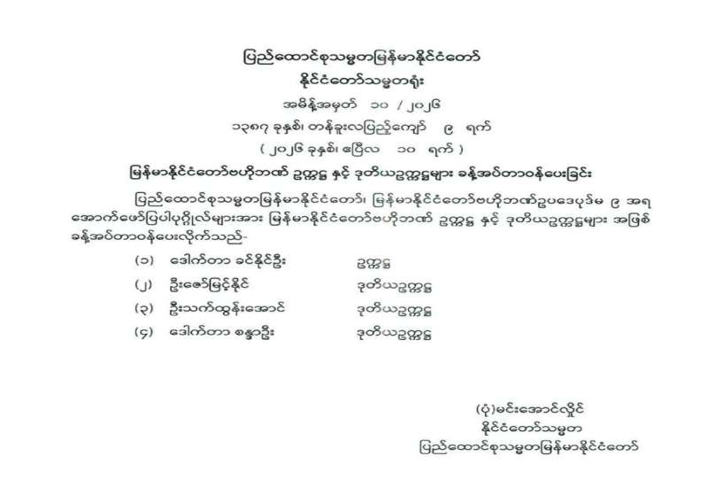 မြန်မာနိုင်ငံတော်ဗဟိုဘဏ်ဥက္ကဋ္ဌနှင့် ဒုတိယဥက္ကဋ္ဌများ ခန့်အပ်တာဝန်ပေးခြင်း