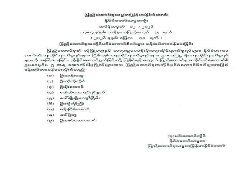 နေပြည်တော်ကောင်စီဥက္ကဋ္ဌ ခန့်အပ်တာဝန်ပေးခြင်း