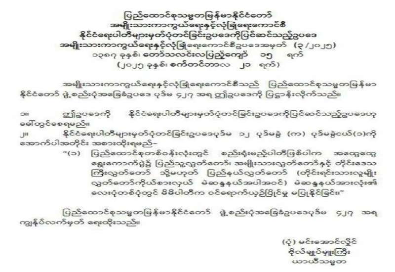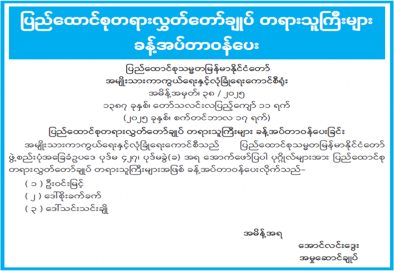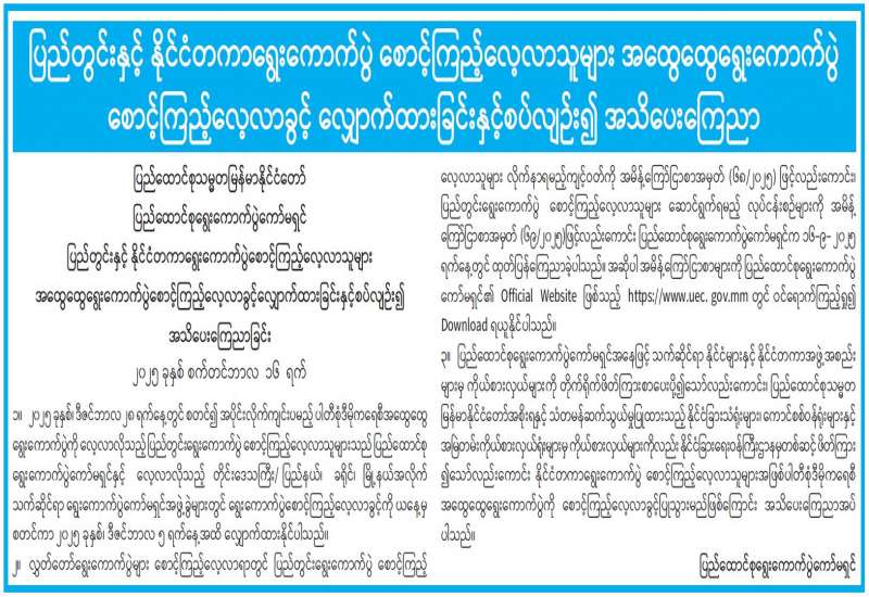 ပြည်တွင်းနှင့် နိုင်ငံတကာရွေးကောက်ပွဲ စောင့်ကြည့်လေ့လာသူများ အထွေထွေရွေးကောက်ပွဲ စောင့်ကြည့်လေ့လာခွင့် လျှောက်ထားခြင်းနှင့်စပ်လျဉ်း၍ အသိပေးကြေညာ