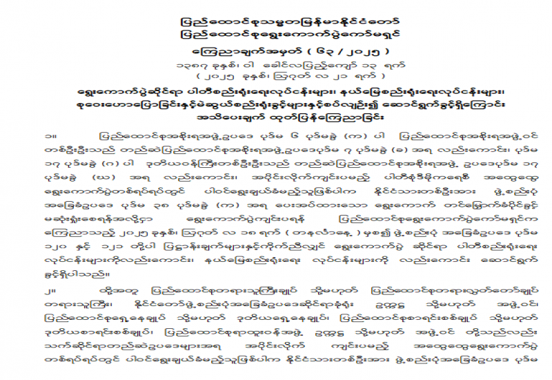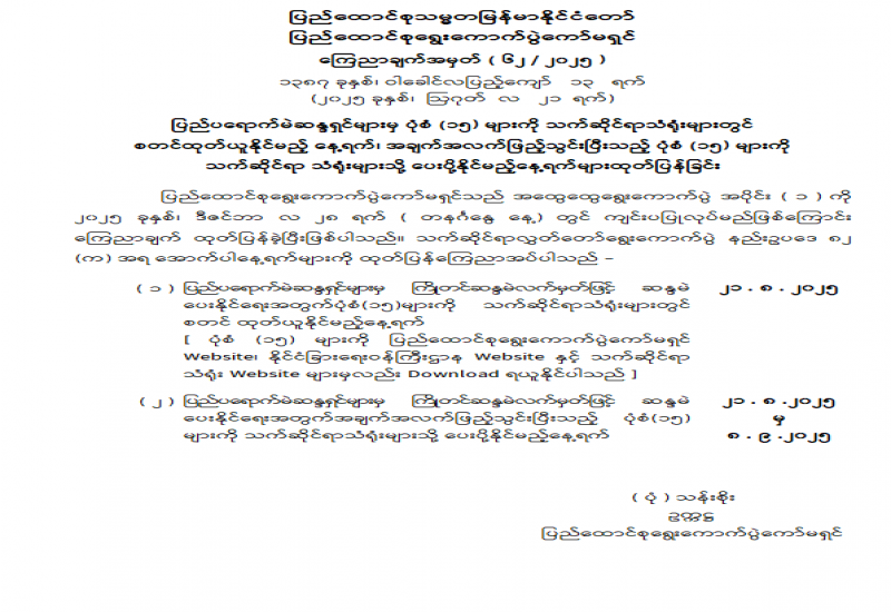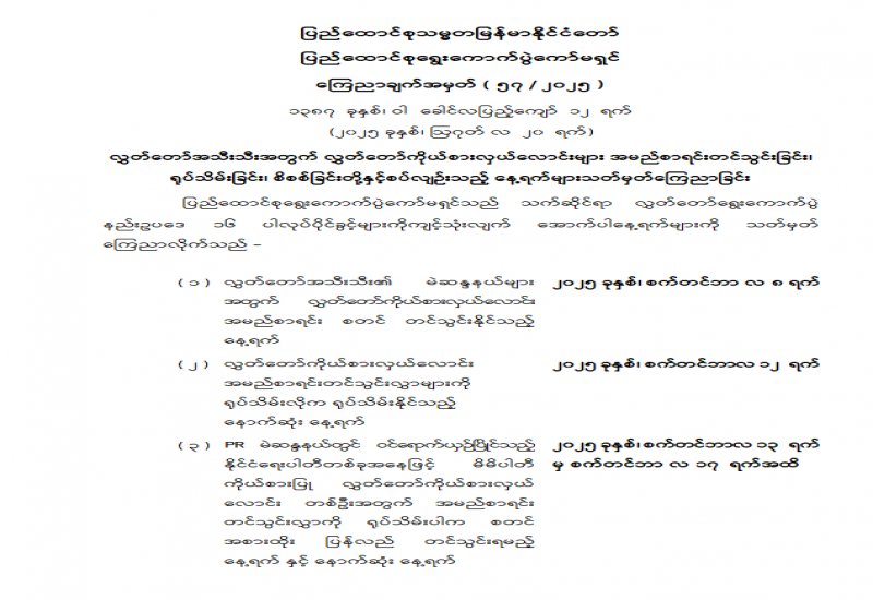 လွှတ်တော်အသီးသီးအတွက် လွှတ်တော်ကိုယ်စားလှယ်လောင်းများ အမည်စာရင်းတင်သွင်းခြင်း၊ ရုပ်သိမ်းခြင်း၊ စိစစ်ခြင်းတို့နှင့် စပ်လျဉ်းသည့် နေ့ရက်များသတ်မှတ်ကြေညာခြင်း