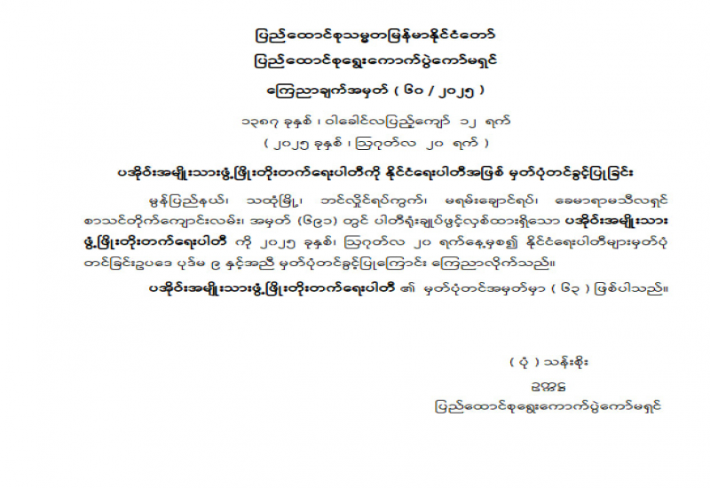 လွှတ်တော်အသီးသီးအတွက် ပါတီစုံဒီမိုကရေစီအထွေထွေရွေးကောက်ပွဲများ ကျင်းပမည့် အပိုင်းလိုက်နေ့ရက်များကို သတ်မှတ်ကြေညာခြင်း