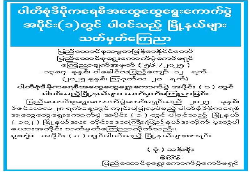 ပါတီစုံဒီမိုကရေစီအထွေထွေရွေးကောက်ပွဲ အပိုင်း (၁) တွင် ပါဝင်သည့် မြို့နယ်များ သတ်မှတ်ကြေညာခြင်း