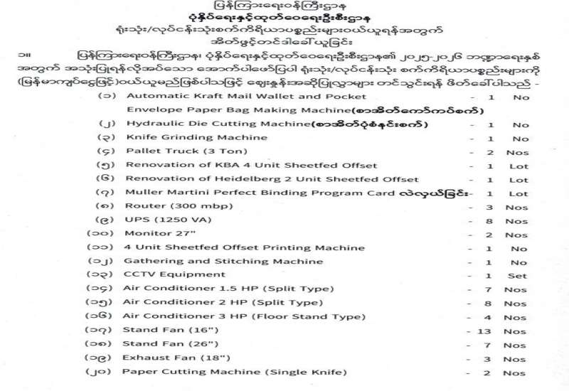 ပြန်ကြားရေးနှင့်ပြည်သူ့ဆက်ဆံရေးဦးစီးဌာန၊ အခြားရုံးသုံးပစ္စည်းနှင့်ရုံးသုံးစက်ကိရိယာများဝယ်ယူရန် အိတ်ဖွင့်တင်ဒါခေါ်ယူခြင်း