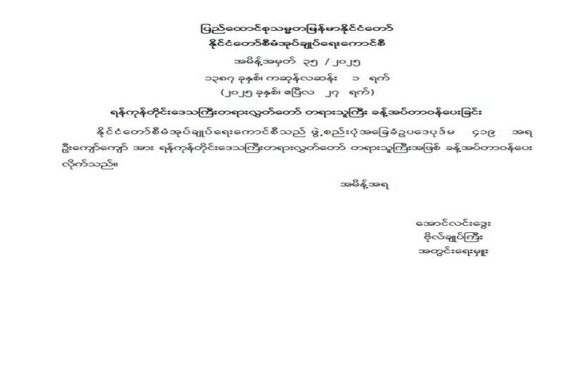 ပြန်ကြားရေးဝန်ကြီးဌာန၊ ပြန်ကြားရေးနှင့်ပြည်သူ့ဆက်ဆံရေးဦးစီးဌာန၏ ၂၀၂၅-၂၀၂၆ ဘဏ္ဍာရေးနှစ်တွင် ပြည်ထောင်စုငွေလုံးငွေရင်းအသုံးစရိတ်ဖြင့် မူပိုင်ခွင့်နှင့်မှတ်ပုံတင်ဌာနခွဲ (ရန်ကုန်)၊ ပင်မရုံးအဆောက်အအုံ အရှေ့ဘက်ခြမ်း အမိုး Slab အား (၅) နှစ်ခံ ရေတားဆေးသုတ်ခြင်း (၁၇၆၀ စတုရန်းပေ)၊ သွပ်လဲလှယ်ခြင်းနှင့် ဒိုင်းပြုပြင်ခြင်း လုပ်ငန်းဆောင်ရွက်ရန်အတွက် ပြန်ကြားရေးဝန်ကြီးဌာန၊ ဝန်ကြီးရုံး၏ သဘောတူညီချက်အရ Father Country Co.,Ltd က ငွေကျပ် ၂၆,၅၀၀,၀၀၀/- ဖြင့် တင်ဒါအောင်မြင်ကြောင်း ကြေညာအပ်ပါသည်။