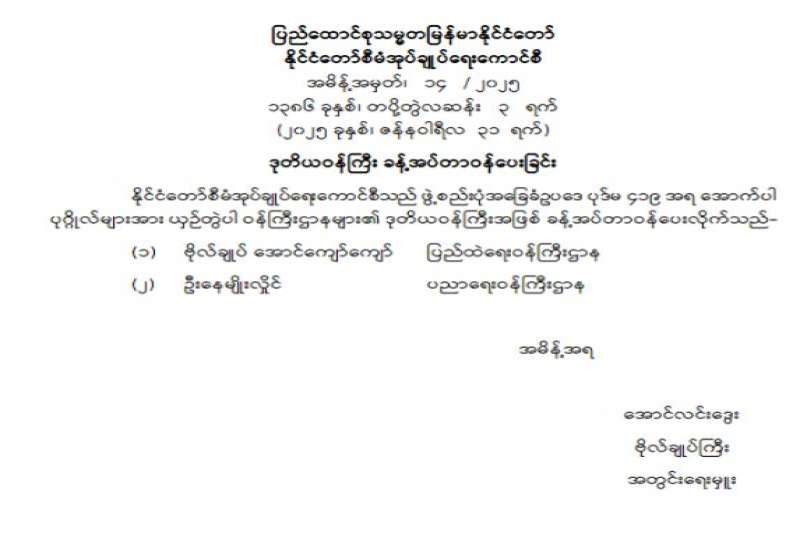ဒုတိယဝန်ကြီး ခန့်အပ်တာဝန်ပေးခြင်း