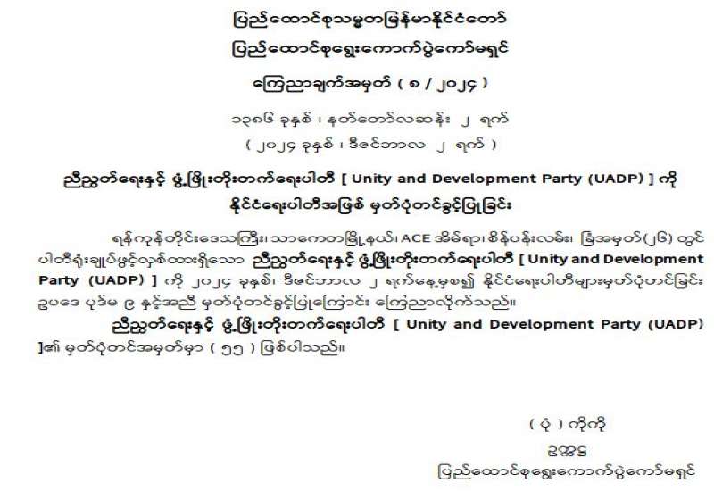 ညီညွတ်ရေးနှင့် ဖွံ့ဖြိုးတိုးတက်ရေးပါတီ [ Unity and Development Party (UADP) ] ကို နိုင်ငံရေးပါတီအဖြစ် မှတ်ပုံတင်ခွင့်ပြုခြင်း