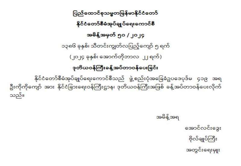 နိုင်ငံတော်စီမံအုပ်ချုပ်ရေးကောင်စီသည် သယံဇာတနှင့် သဘာဝပတ်ဝန်းကျင်ထိန်းသိမ်းရေးဝန်ကြီးဌာန၊ သစ်တောဦးစီးဌာန ညွှန်ကြားရေးမှူးချုပ် ဒေါက်တာသောင်းနိုင်ဦးကို အစမ်းခန့်ကာလ (၁)နှစ် ပြည့်မြောက်သည့်နေ့မှစ၍ အတည်ပြုခန့်ထားလိုက်သည်။
