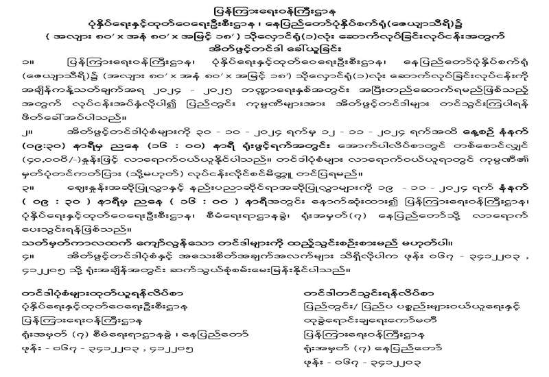 ပြန်ကြားရေးဝန်ကြီးဌာန ပုံနှိပ်ရေးနှင့်ထုတ်ဝေရေးဦးစီးဌာန ၊ နေပြည်တော်ပုံနှိပ်စက်ရုံ(ဇေယျာသီရိ)၌ ( အလျား ၈ဝ ပေ x အနံ ၈ဝ ပေ x အမြင့် ၁၈ ပေ ) သိုလှောင်ရုံ(၁)လုံး ဆောက်လုပ်ခြင်းလုပ်ငန်းအတွက် အိတ်ဖွင့်တင်ဒါ ခေါ်ယူခြင်း
