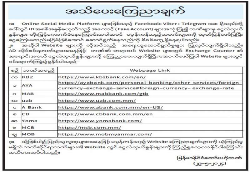 ၁။ Online Social Media Platform များဖြစ်သည့် Facebook၊ Viber ၊ Telegram အစ ရှိသည်တို့ ပေါ်တွင် ID အစစ်အမှန်မဟုတ်သည့် အကောင့် (Fake Account) များအသုံးပြု၍ ဘဏ်များမှ ငွေလဲလှယ်နှုန်းများ တိုးမြှင့်ကောက်ခံနေကြောင်းအပါအဝင် မမှန်ကန်သည့်သတင်းများကို ထုတ်ပြန်ဖော်ပြပြီး ငွေကြေးမတည်မငြိမ်ဖြစ်အောင် ဆောင်ရွက်နေသည်ကို စိစစ်တွေ့ရှိနေရပါသည်။