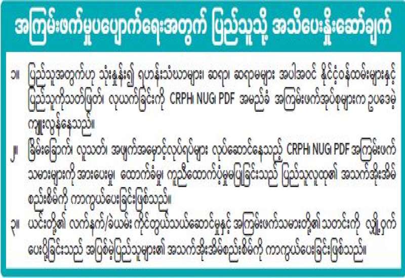 ၁။ ပြည်သူအတွက်ဟု သုံးနှုန်း၍ ရဟန်းသံဃာများ၊ ဆရာ၊ ဆရာမများအပါအဝင် နိုင်ငံ့ဝန်ထမ်းများနှင့် ပြည်သူကိုသတ်ဖြတ်၊ လုယက်ခြင်းကို CRPH၊ NUG၊ PDF အမည်ခံအကြမ်းဖက်အုပ်စုများက ဥပဒေမဲ့ ကျူးလွန်နေသည်။