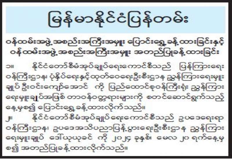 ၁။ မြန်မာနိုင်ငံတော်ဗဟိုဘဏ်ဥပဒေ ပုဒ်မ ၄၀(င)နှင့် ပုဒ်မ ၆၂ တို့အရ မြန်မာနိုင်ငံတော် ဗဟိုဘဏ်သည် ပြည်တွင်းသုံးငွေကို တစ်ဦးတည်းထုတ်ဝေသူနှင့် စီမံခန့်ခွဲသူဖြစ်ပါသည်။